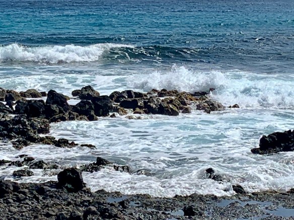 placeholder://We then drove south to Poipu and had lunch at the aforementioned beach restaurant. After lunch we walked over the beach to check out the surf. Some of the breakers were over 6′ high. Impressive but nothing compared to the north shore during the winter. Too bad I wont be back to try them on my big board. (If I had a big board or had ever surfed.)