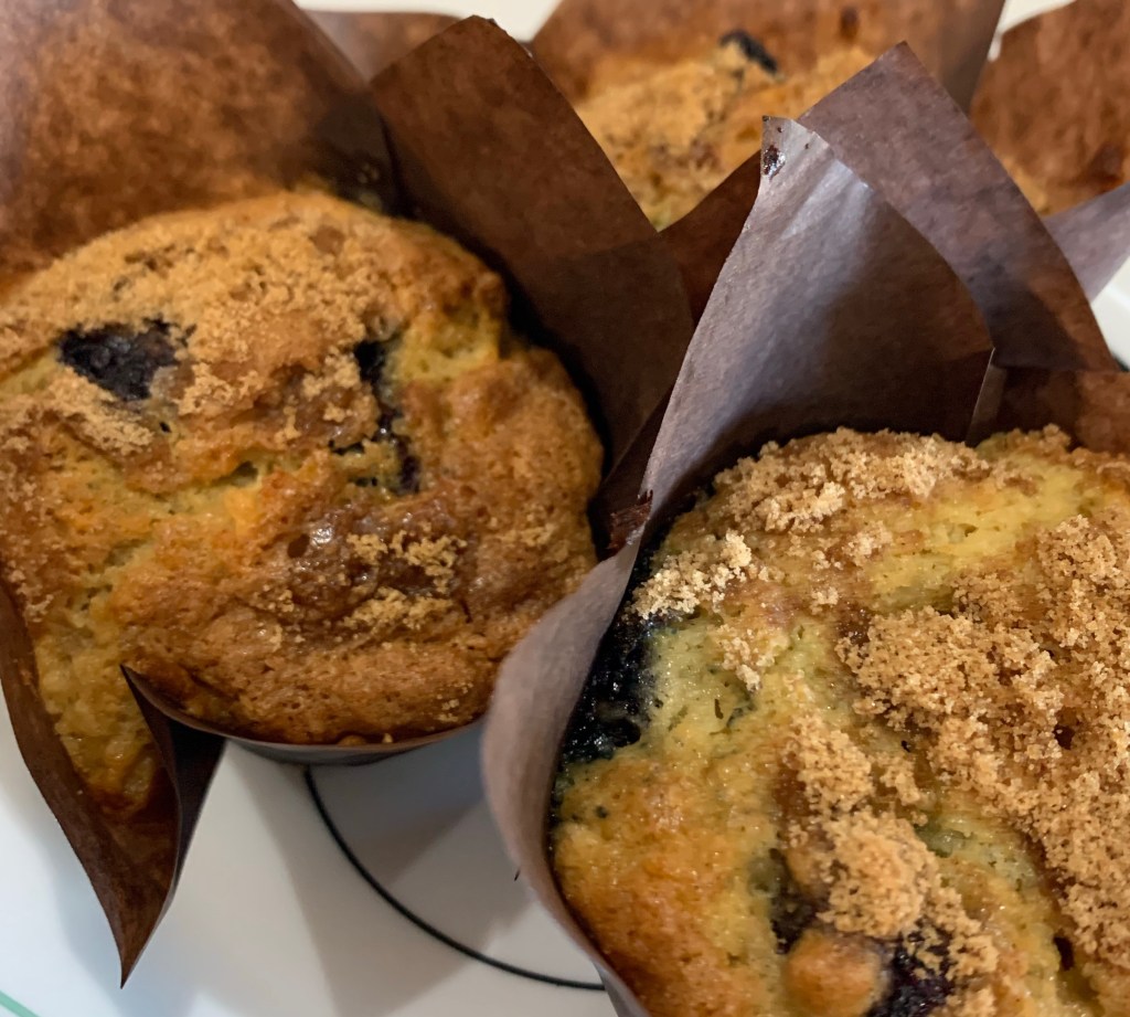 I wanted to try a new recipe for blueberry muffins that purported to yield soft, moist, not dense muffins. I also had some new ‘tulip’ muffin papers to try. These were advertised to not need a muffin pan (read that as one less pan to wash.) In use, the papers were too thin, therefore too flimsy to not need the support of a muffin pan.