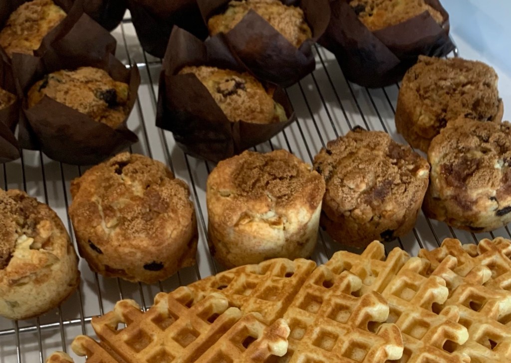 While the oven was hot I also made a batch of apple/raisin ‘scones’. Scones are in quotes as they are un-traditional. I made them in an ring mold pan to force them to rise up the sides rather than spread horizontally. (They did.) The same brown sugar and cinnamon crumble was used on both the scones and muffins. It was a good experiment, but I prefer my standard, traditional drop berry scones topped with sparkling sugar.