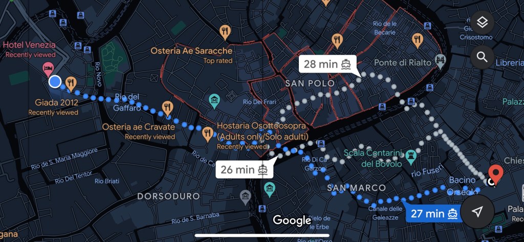 We walked from our hotel to Piazza San Marco to tour the Doge’s Palace and Basilica San Marco starting at 9AM. Google Maps said it was 1.2 miles and take us 27 minutes.