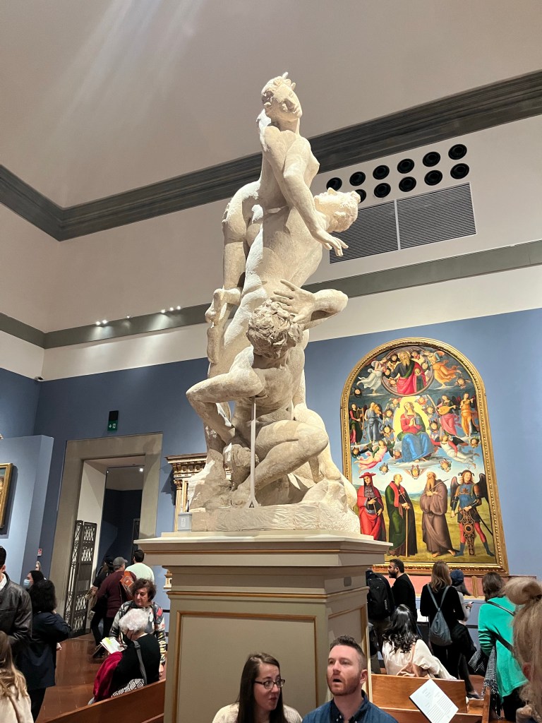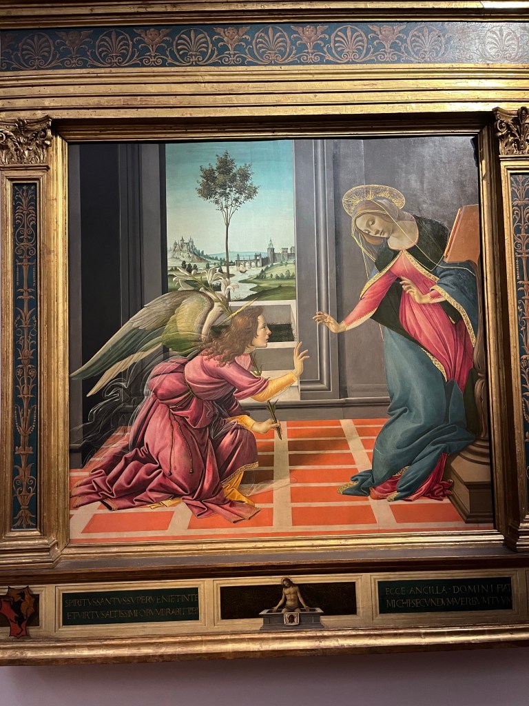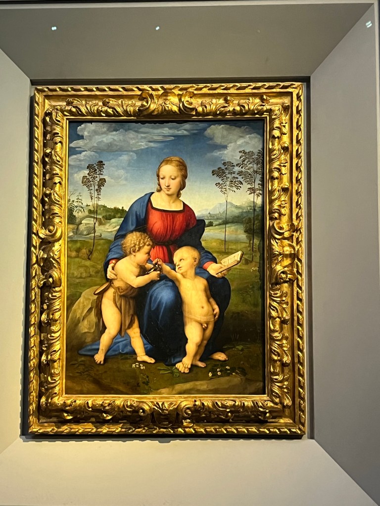 Trying to describe the fabulous artwork would be an impossible (for me) task. Our guide led us through medieval to renaissance art and masters. She pointed out the various depictions of Mary and Jesus by Botticelli, Raphael, Michelangelo and da Vinci. She described how the use of color, perspective and proportion developed over the centuries. Just enjoy the pictures as we did the originals.