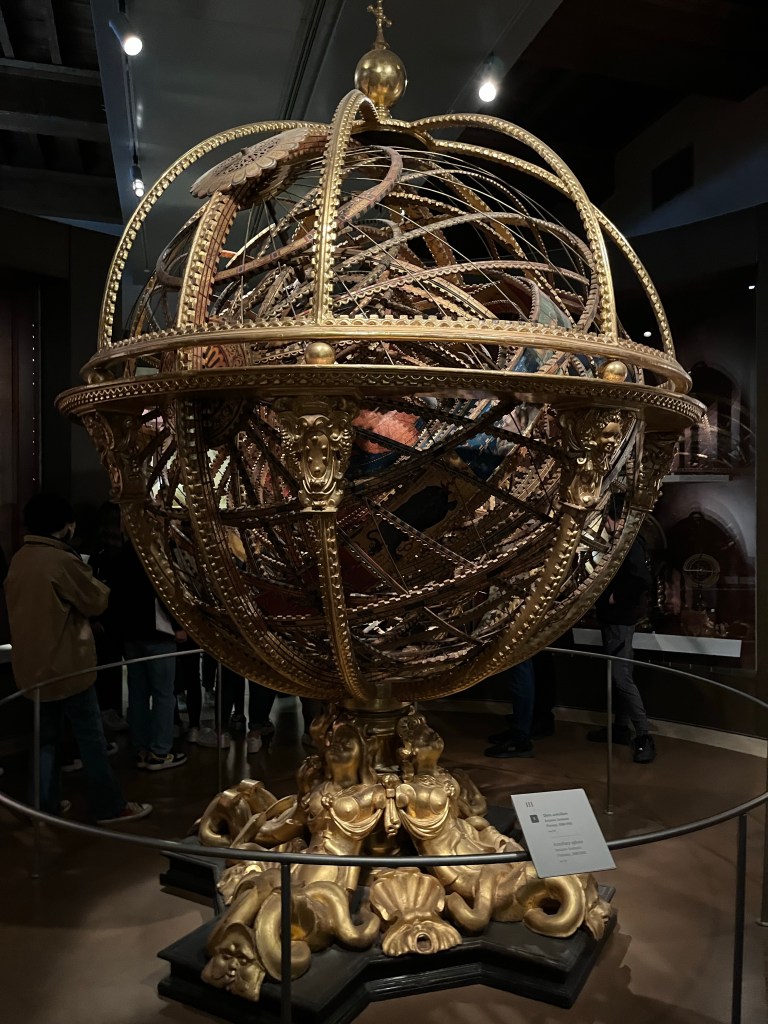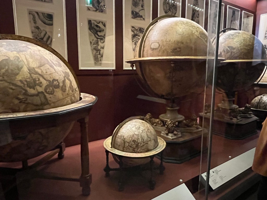 The globes on the right were made by Vincenzo Maria Corronelli in 1693. He previously made globes nearly 4 meters in diameter for King Louis XIV of France which are part of the Medici collection.
