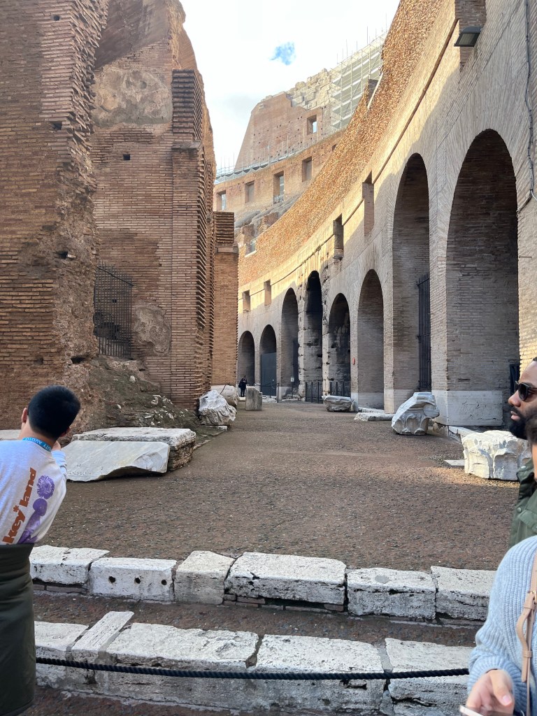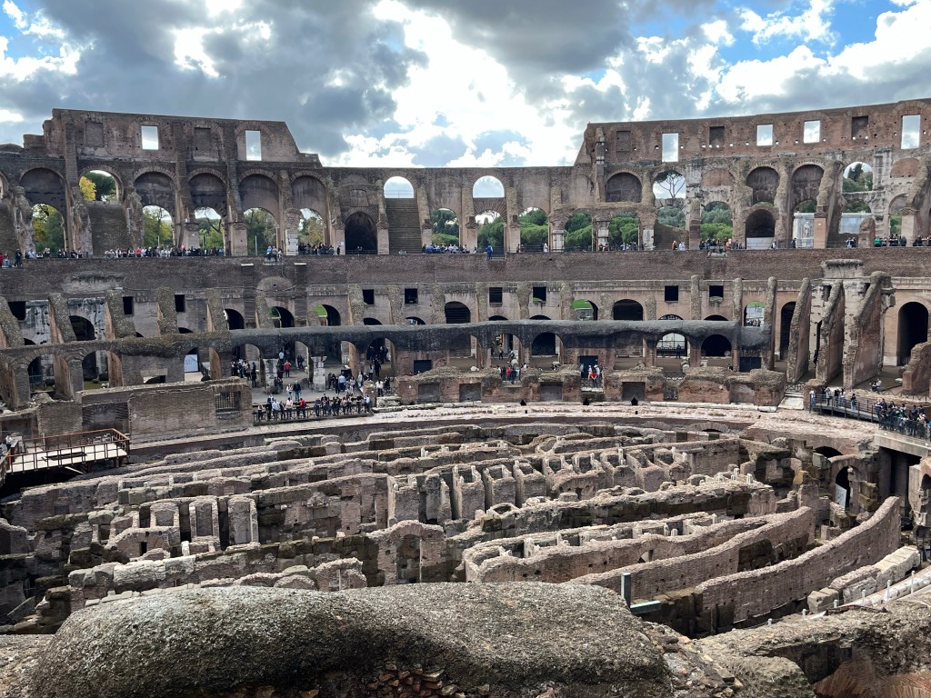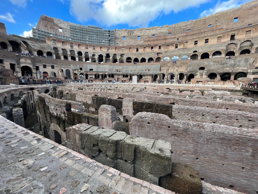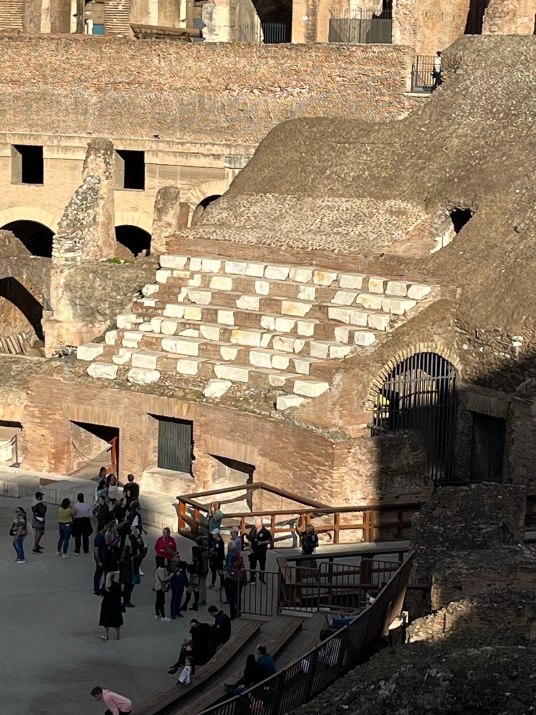 Here is a selection of photos from inside the Colosseum showing the seating, supports for the wooden floor, which of course was destroyed long ago, either re-purposed, burned for heat, or disintegrated, the seats (the richer you were the lower, and closer to the action, you sat) and catacombs beneath the stage for gladiators, animals and set decorations.