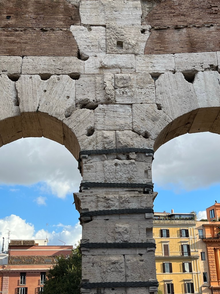 Arches were also very popular, and still are. The holes in the walls are also interesting. One set was used to fasten the marble facade to the stone. The marble was scavenged to make other buildings in Rome. Another set was used to connect the stone blocks together for stability. The clamps they used were iron, which again was scavenged. We are lucky there is anything left.