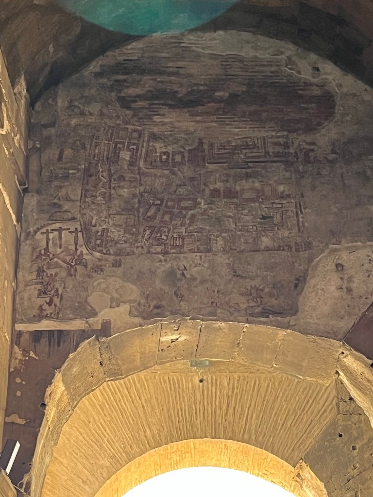 Above one arch is a painted map of Jerusalem. I cannot find a definitive reason why it is there, but it may be related to the story that the Romans may have sacked the Jewish temple to help pay for the Colosseum.