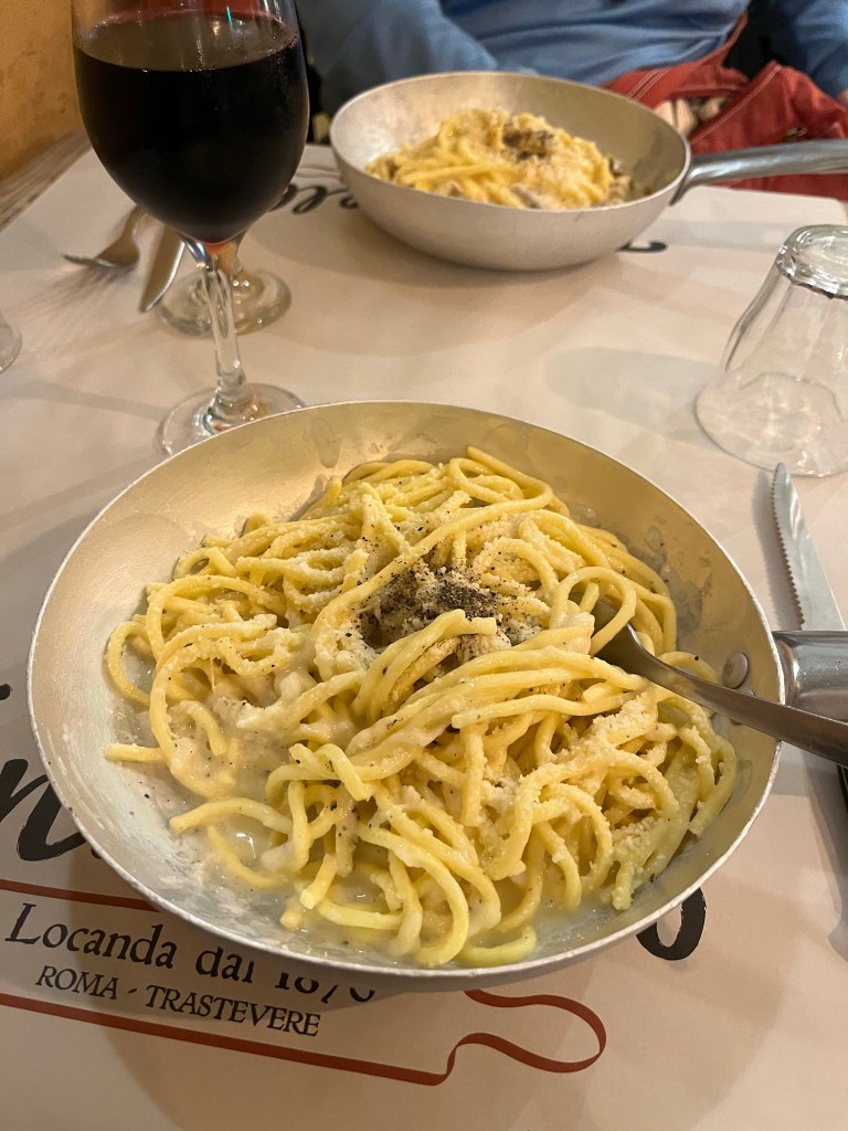 We ordered house rose (for QC) and house red (Montepulciano) for me and were pleased with both. We then ordered our first course, Carbonara and Cacio E Pepe and both were wonderful. Then another round of wine. We then ordered a second course of Polo Ala Romano to split between us.