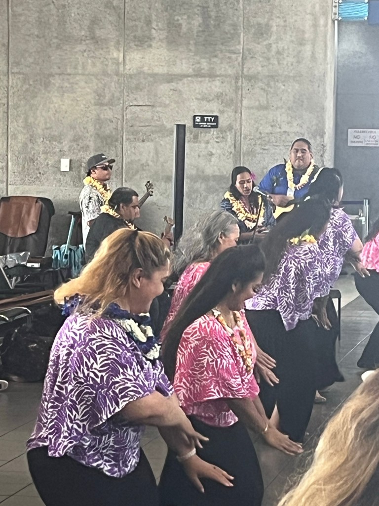 While waiting we, and all the other travelers were entertained with a group of hula dancers and musicians! A very nice way to spend the time.